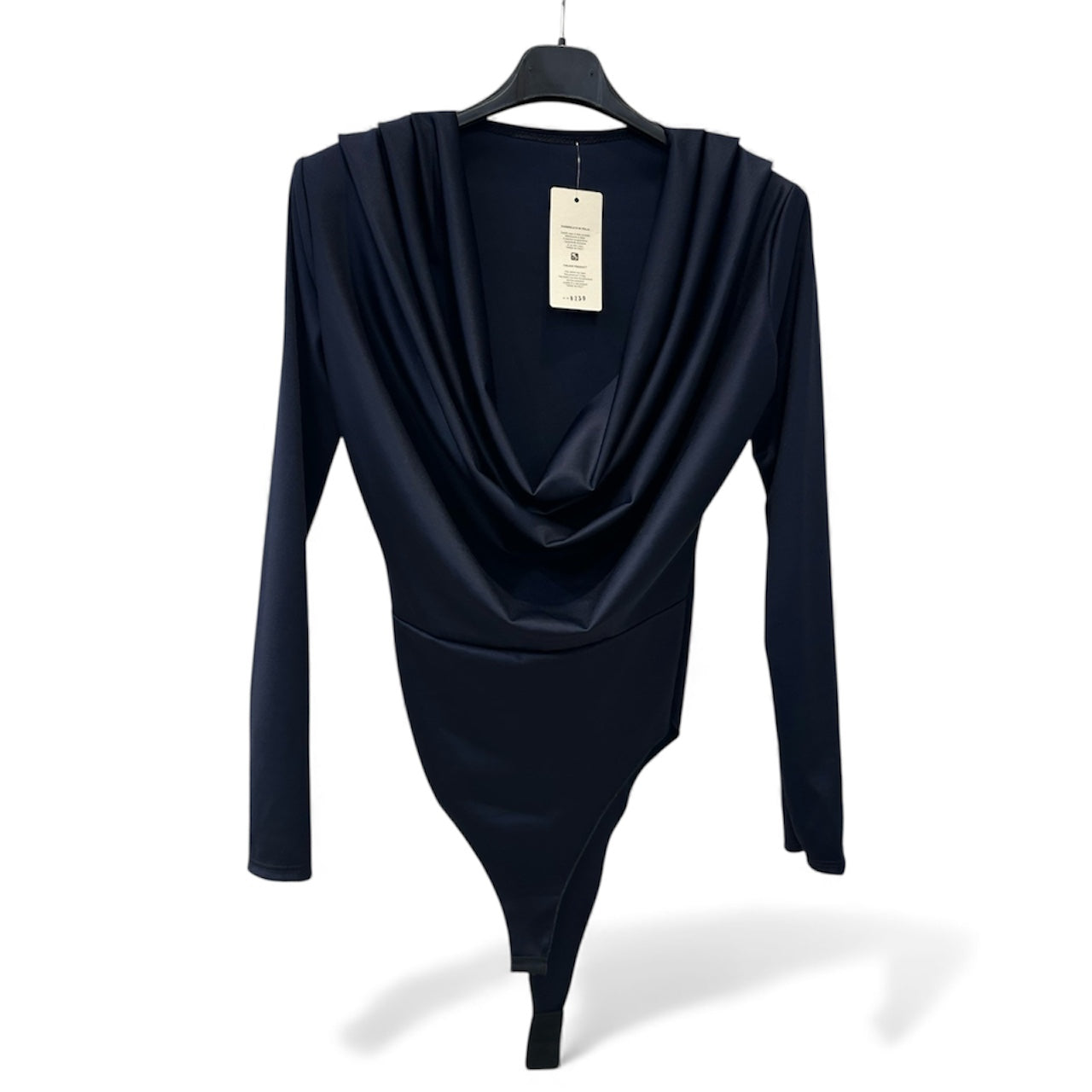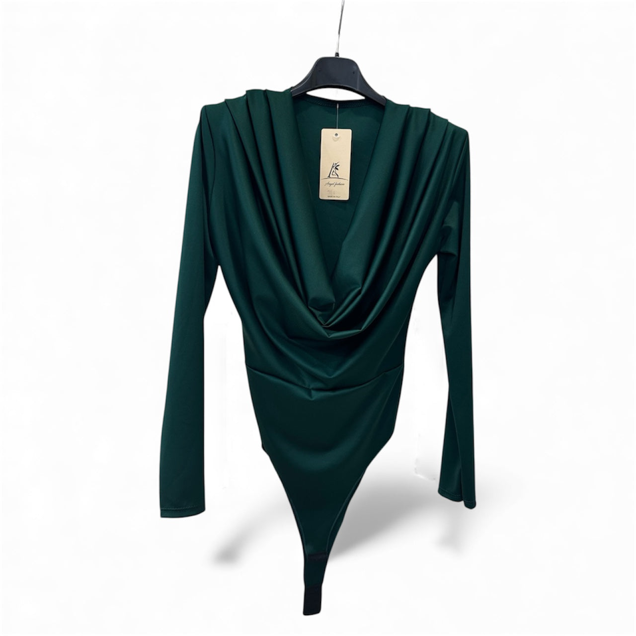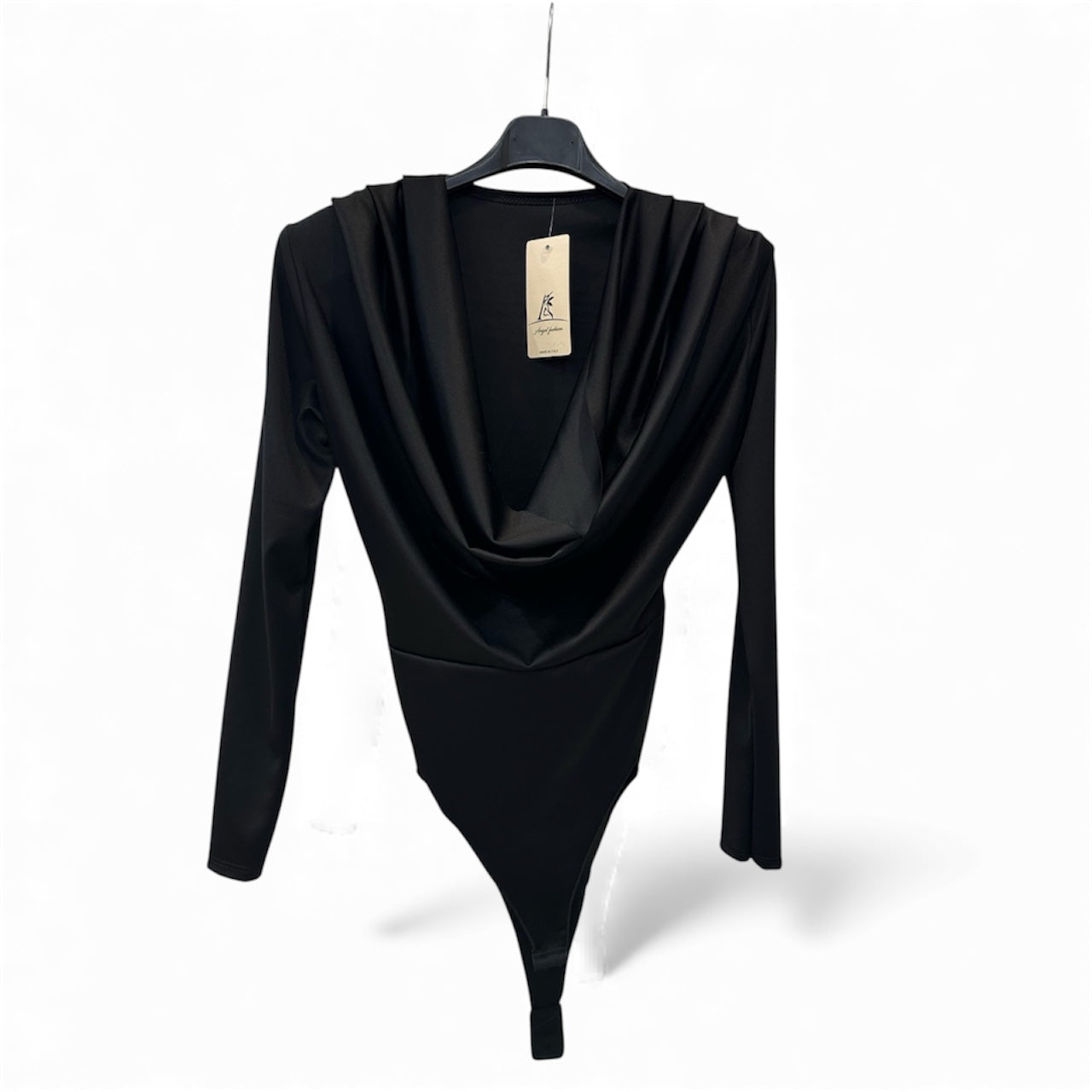 Il body presenta maniche lunghe e un elegante scollo drappeggiato che cade morbidamente sul davanti.Disponibile in diversi colori