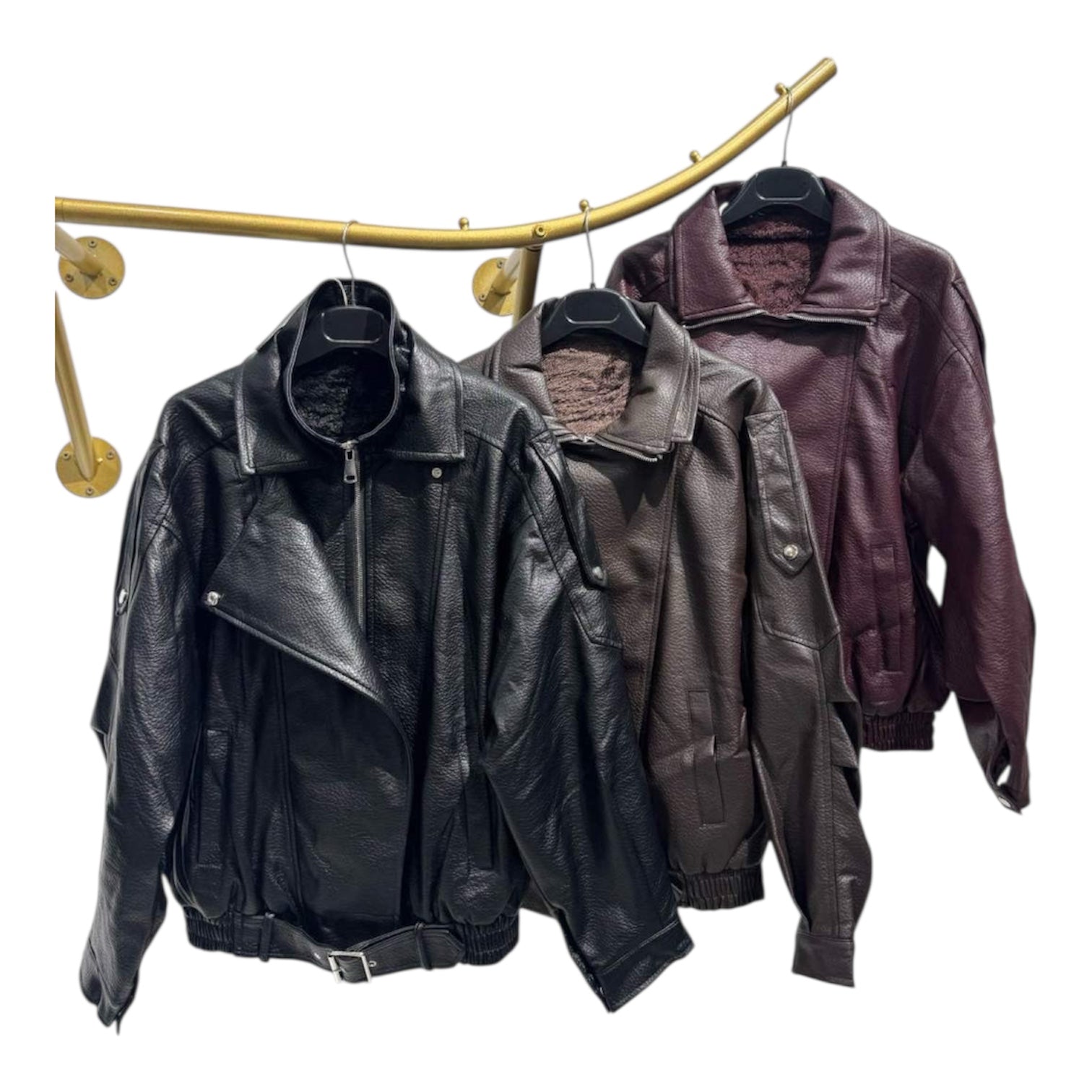 Giacche in similpelle da donna, disponibili in vari colori.Il design "bubble leather" le rende capi di tendenza, adatti a un abbigliamento casual. Presentano caratteristiche classiche dei giubbotti biker, come la chiusura asimmetrica con zip e i bottoni a pressione sul colletto.