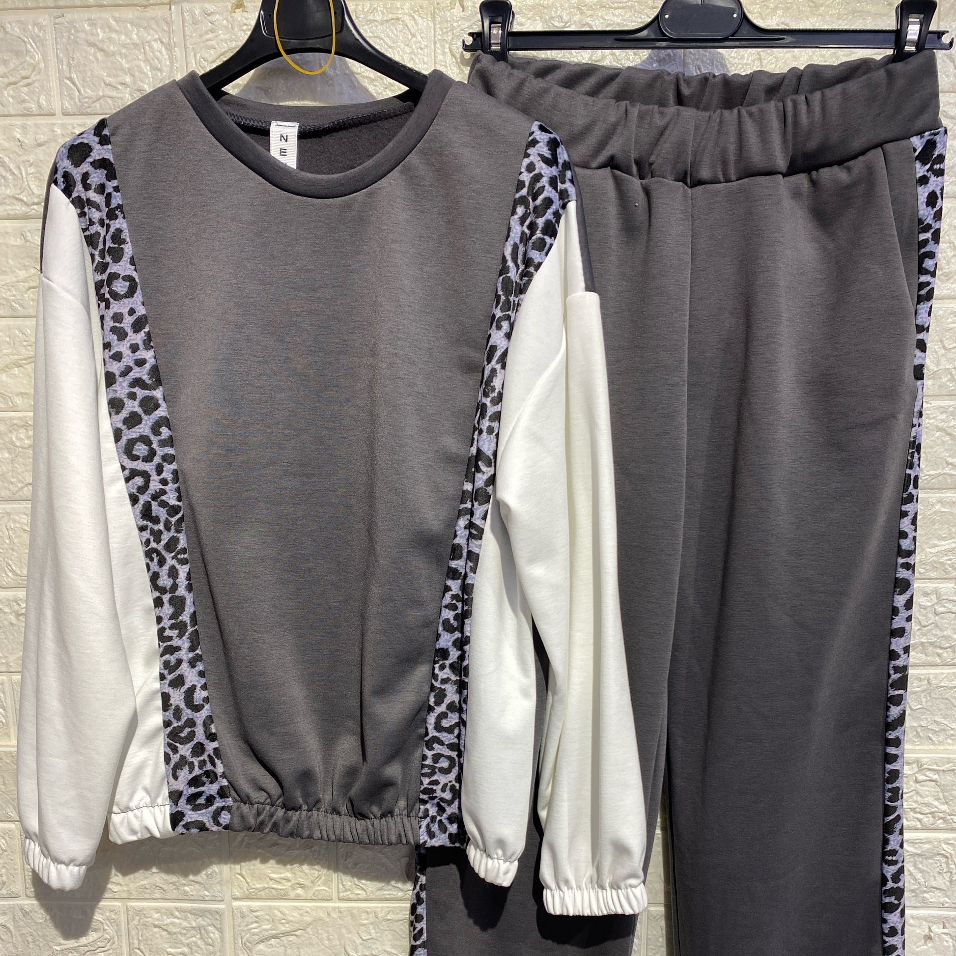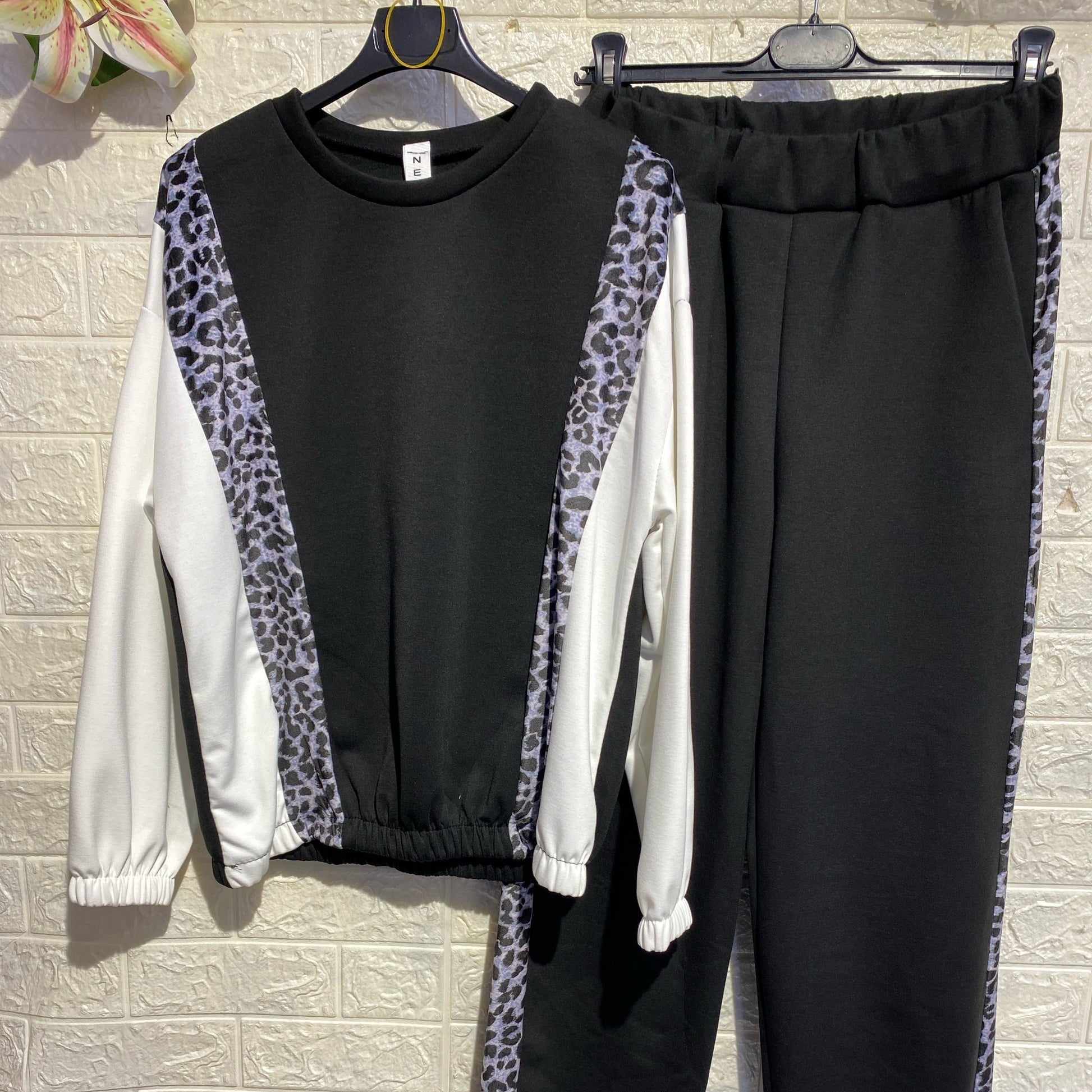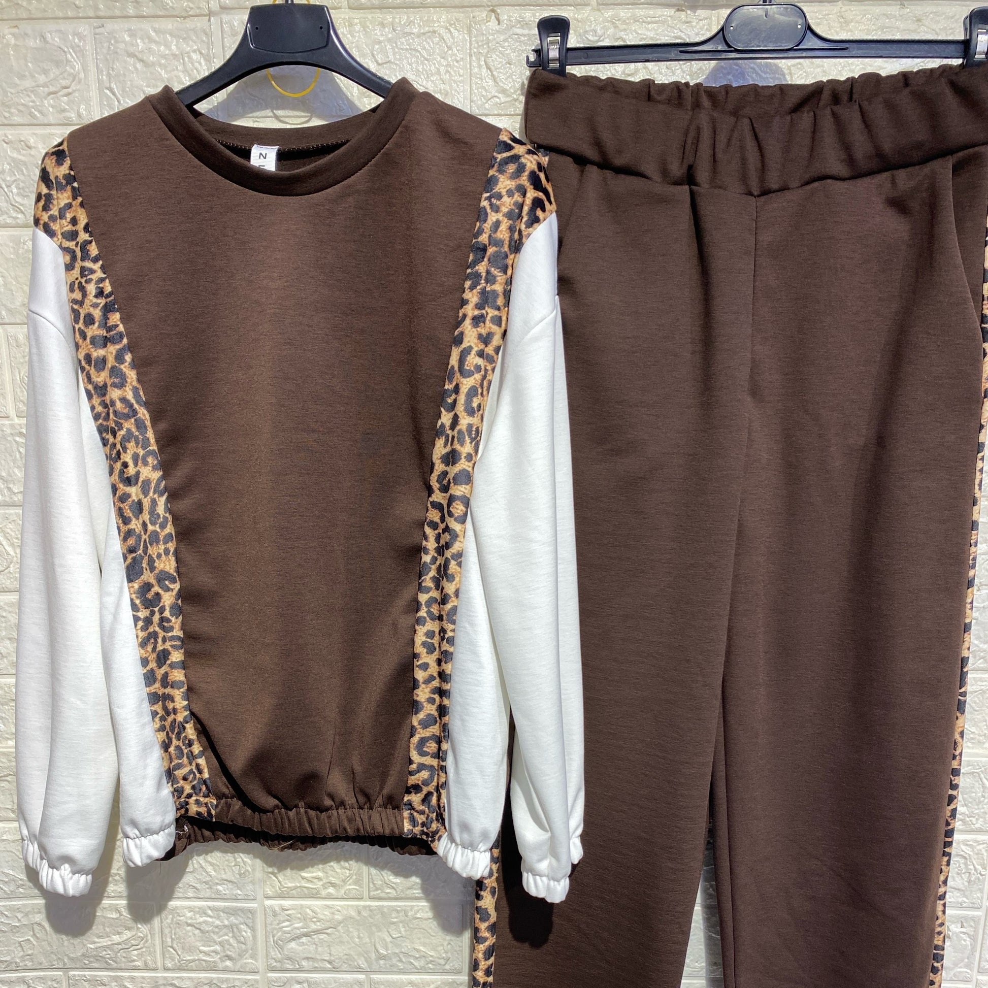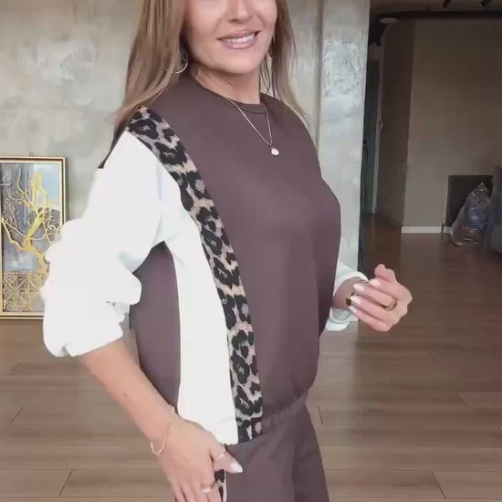 tuta sportiva o loungewear con dettagli animalier/leopardati.La felpa ha un girocollo e un elastico in vita e sui polsini. I pantaloni sono a gamba dritta o larga, con elastico in vita e i dettagli leopardati lungo i lati.