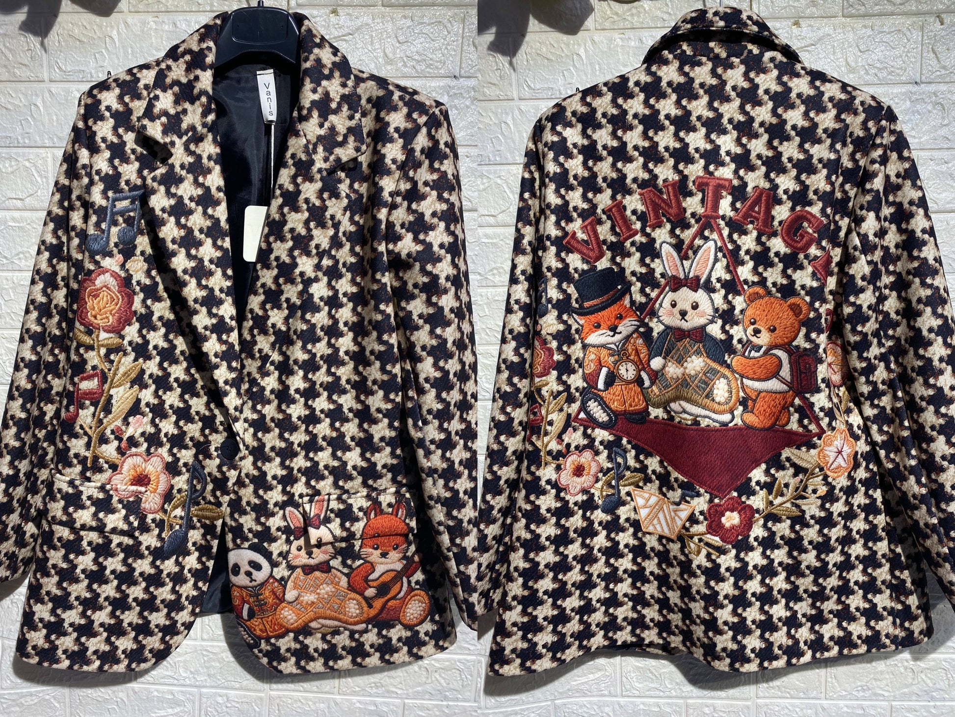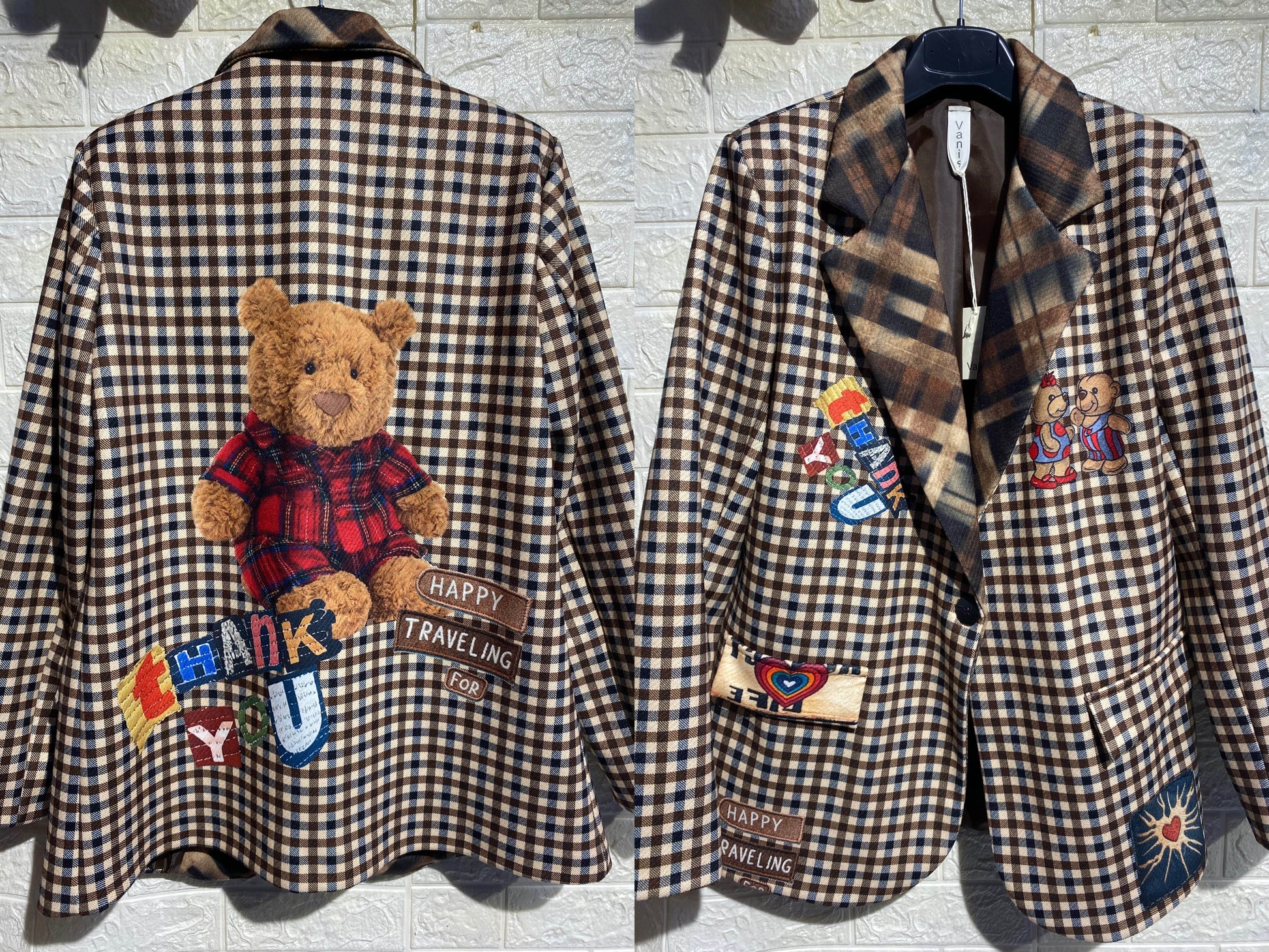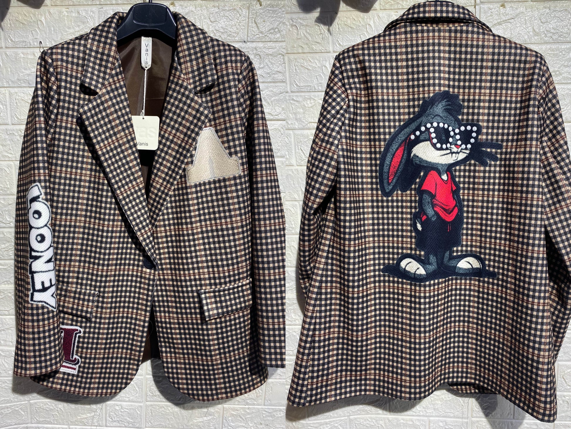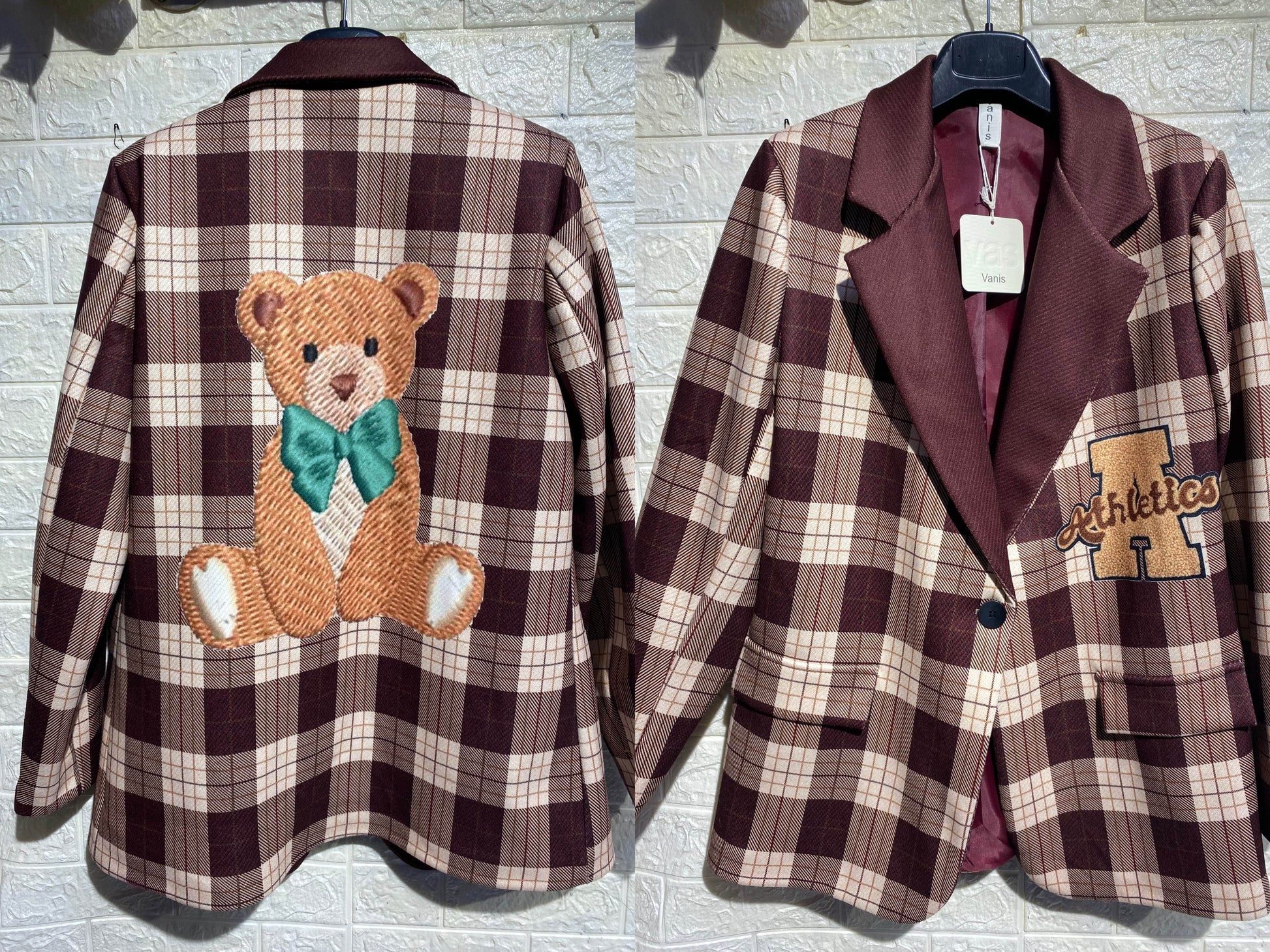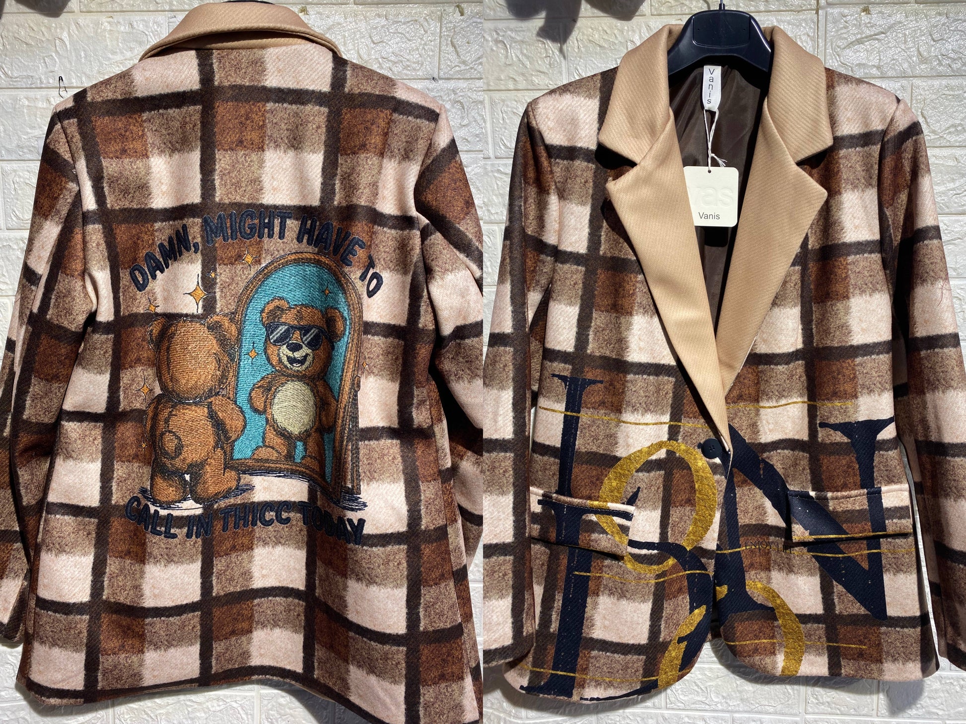 Blazer oversize con motivo a quadri marrone e beige. Presenta dettagli distintivi come un colletto in velluto a costine e spalline imbottite. La fodera interna contribuisce al comfort.